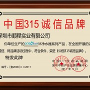公司简介深圳市顺程实业有限公司是一家集研发、生产、销售于一体的水处理高科技企业,主要生产以21世纪六大高新技术之一的超滤膜为核心材料的家用、商用净水器(净水机)。主要产品有:获得多项国家专利的直饮净水器(净水机)、厨房净水器(净水机)、中央超滤净水器(净水机)、中央净水机(净水器)、普通净水器(净水机)、中央软水机等六大系列,上百种产品,产品市场前景广阔,极具竞争力。顺程实业有限公司严格执行ISO9001:2000质量管理体系,从产品设计开发、来料检验、生产过程检验、成品检验等全程严格控制产品质量;顺程实业有限公司一直与美国OSMONICS、KDF、FLECK等国际著名净水设备厂商密切合作,在国内净水技术领域一直处于领先地位,永保技术领先,为消费者生产确保饮水安全的净水器系列产品。优良的品质,完善的服务,使我们的产品遍布全国30多个省市自治区,并远销到东南亚、中东、欧美等多个国家和地区,深得用户信赖。